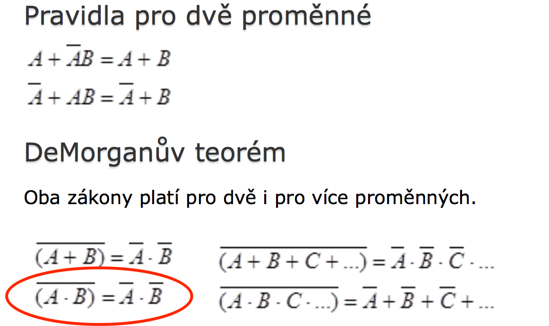 Zákony booleovy algebry využíváme pro úpravy logických obvodů... De morgan's theorem may be applied to the negation of a disjunction or the negation of a conjunction in all or part of a formula. • pochopí a na samostatně volených příkladech objasní fakt, že předávání dědičných předpokladů v … Je zobecněním běžné distributivity násobení vůči sčítání čísel, kdy můžeme roznásobit sčítání. Ve skutečnosti, věřte mi nebo ne, si v celé číslicové technice vystačíte s jedním jediným typem hradla!