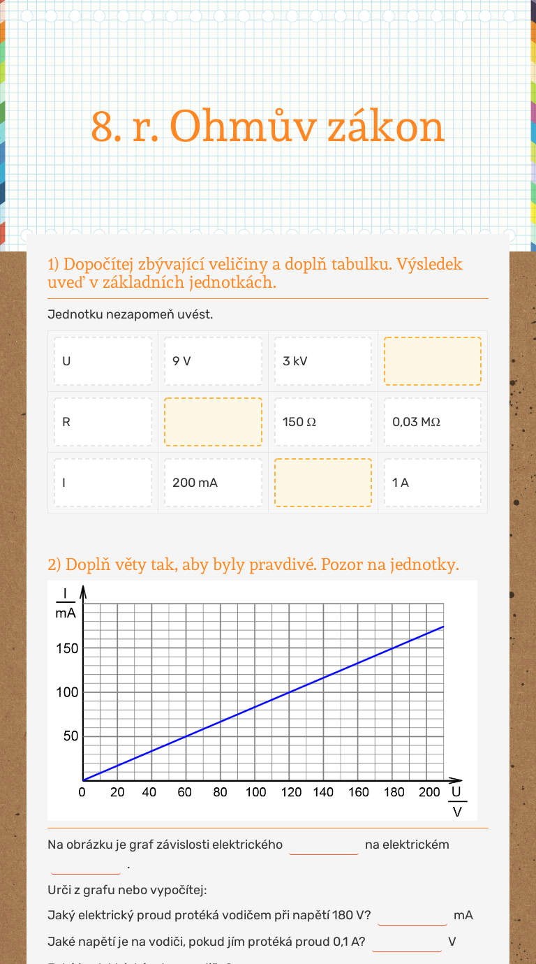 Náš pokus bude spočívat v tom, že v obvodu s rezistorem a ampérmetrem budeme postupně zmenšovat velikost napětí a zaznamenávat proud rezistorem. Konstantou této úměrnosti je převrácená hodnota odporu vodiče r, tedy:. Základní pokus výsledky pokusu ohmův zákon rezistor , reostat.